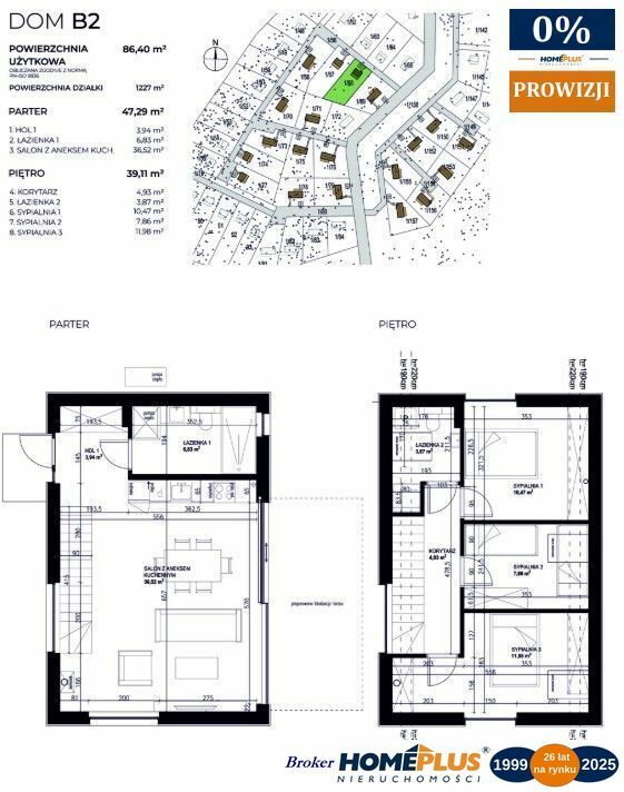 Budynek B2 - pow. domu 86,4 m (parter: 47,29 m, piętro: 39,11 m),